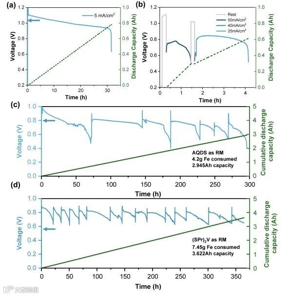 图4中显示了RM-IAFC的性能,作者分别使用AQDS与(SPr)2V分子在负极电解液中作为RM进行测试。在正极电解液中Fe3+过量的情况下,该电池可在5-50 mA/cm2的电流密度范围下放电工作。同时,金属铁的利用率可超过80%。该电池在2 mA/cm2的电流密度下连续工作超过350小时,累计放电达3.6 Ah。基于负极电极液15 mL的体积,其体积比容量可达241 Ah/L。