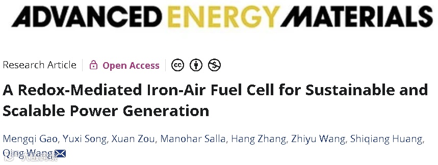 近日,来自新加坡国立大学和新加坡国立大学苏州研究院的王庆教授课题组,在Advanced Energy Materials期刊上发表题为“A Redox-Mediated Iron-Air Fuel Cell for Sustainable and Scalable Power Generation”的研究文章。该工作提出了一种新型的铁-空气燃料电池结构(图1):利用氧化还原介质的电化学-化学反应循环,将金属铁的氧化反应与氧气的还原反应转移到化学反应器中,解决了铁金属直接作为电极的钝化问题,也消除了空气电极对贵金属催化剂的需求,对铁-空气电池的实际应用做出了新的探索。