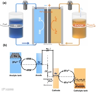 图1. (a) RM-IAFC的结构和运行示意图。(b) 氧化还原靶向反应的能量图:铁金属与RM在负极电解液罐中反应,O2与Fe2+/3+在正极电解液罐中反应。正负极电解液均采取电化学-化学循环过程。