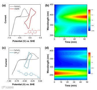 图2. (a) AQDS和FeCl2的CV曲线。(b) AQDS电解液的原位紫外可见光谱,在加入铁粉后的变化。(c) (SPr)2V和FeCl2的CV曲线。(d) (SPr)2V电解液的原位紫外可见光谱,在加入铁粉后的变化。