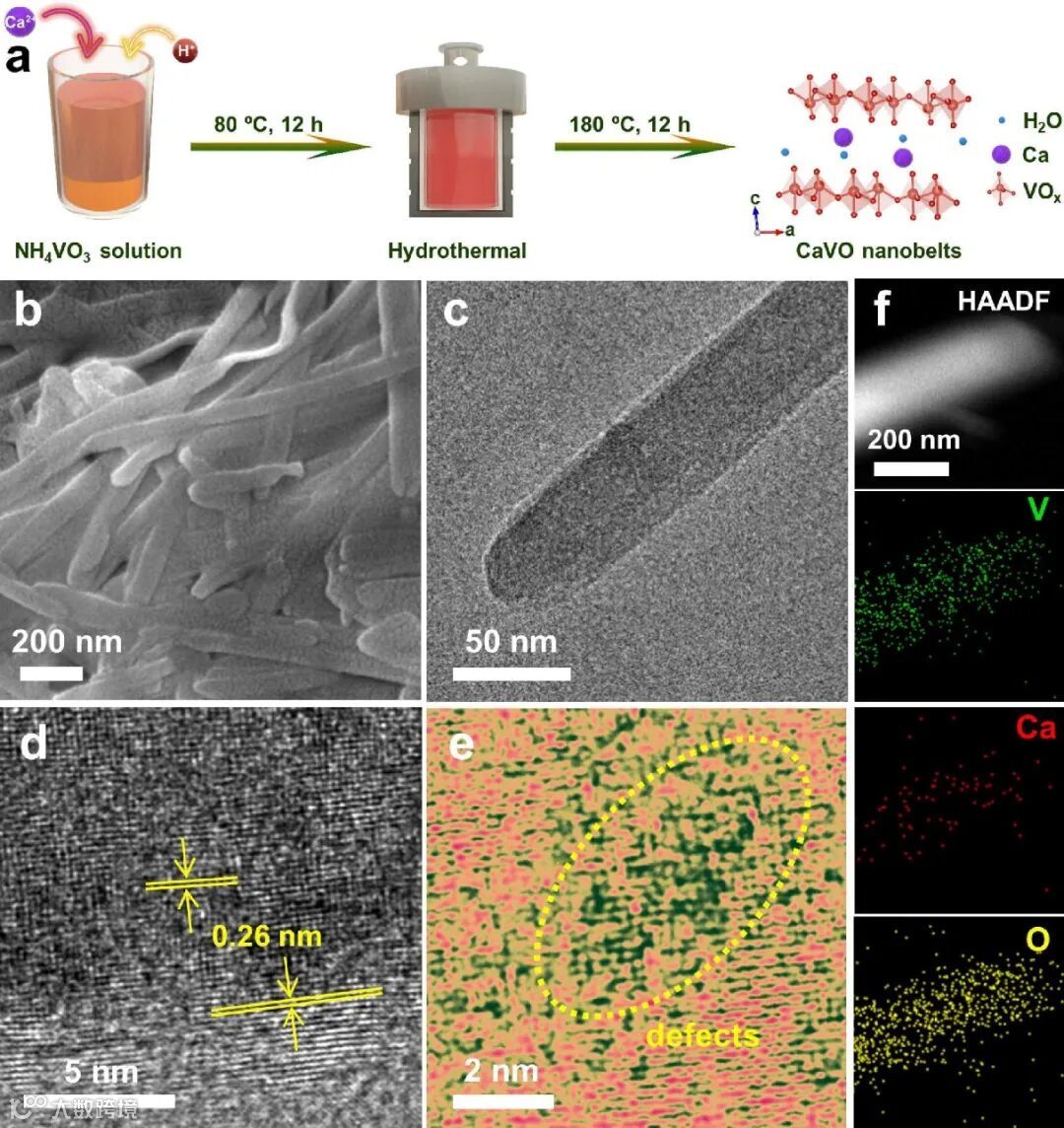 图1. CaVO的合成示意图(a),SEM(b), TEM(c),高分辨TEM (d, e)和元素分布(f).