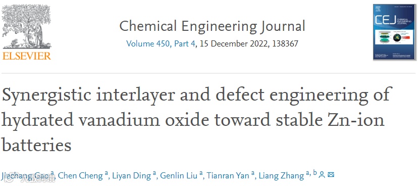 基于此,来自苏州大学的张亮教授课题组在Chemical Engineering Journal上发表题为“Synergistic interlayer and defect engineering of hydrated vanadium oxide toward stable Zn-ion batteries”的观点文章。