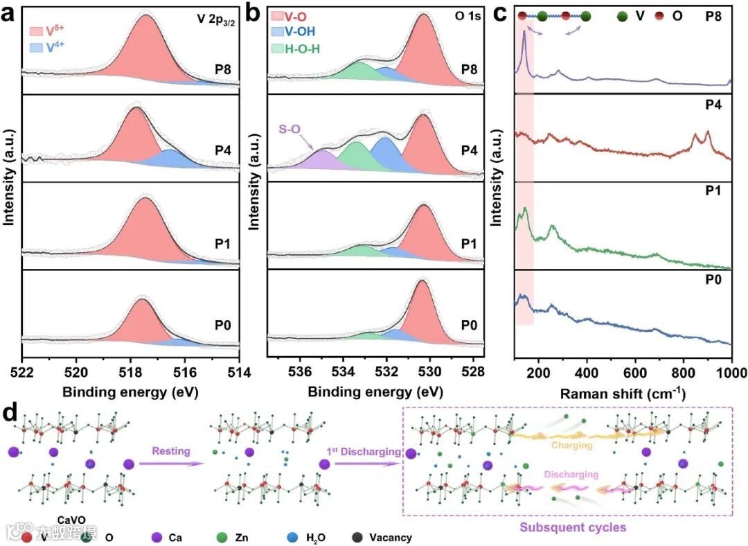 图 5. 首圈循环不同充电态下CaVO-5的V 2p3/2(a),O 1s(b)的XPS谱图和Raman 光谱. (d)反应机理示意图.