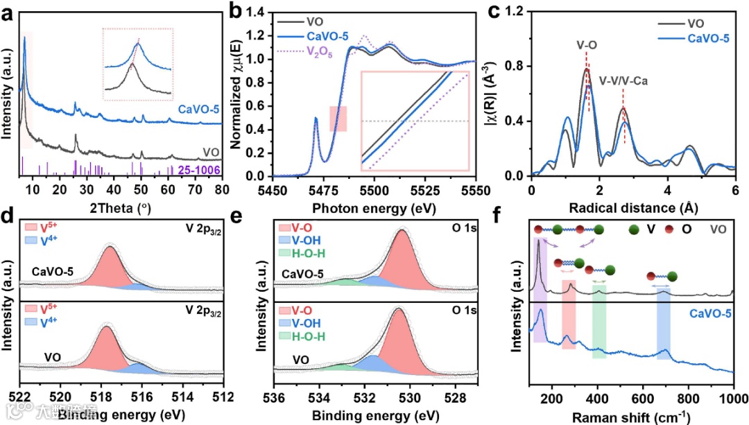 图2. VO和CaVO-5的XRD(a),V K-edge XANES谱(b)和FT-EXAFS谱(c), V 2p3/2 (d) and O 1s(e) XPS谱以及Raman光谱(f).