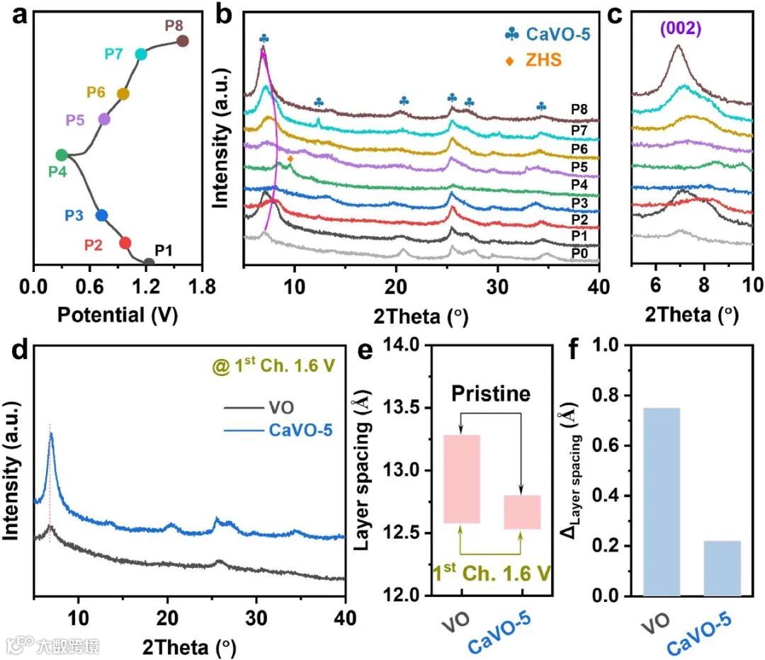 得益于上述协同作用,CaVO表现出了相对稳定的结构稳定性。而且,非原位XRD,XPS和Raman等表征手段阐述了CaVO在循环过程中发生的是Zn2+,H+和水分子多种离子/分子共嵌的反应过程,并且在这个过程中CaVO展现了较高的结构可逆性。此外,作者还发现循环过程中占据阳离子空位的Zn2+并不能被完全释放的现象,猜测这些在V-O框架中不能被释放的Zn对框架结构的稳定性也存在一定的贡献。