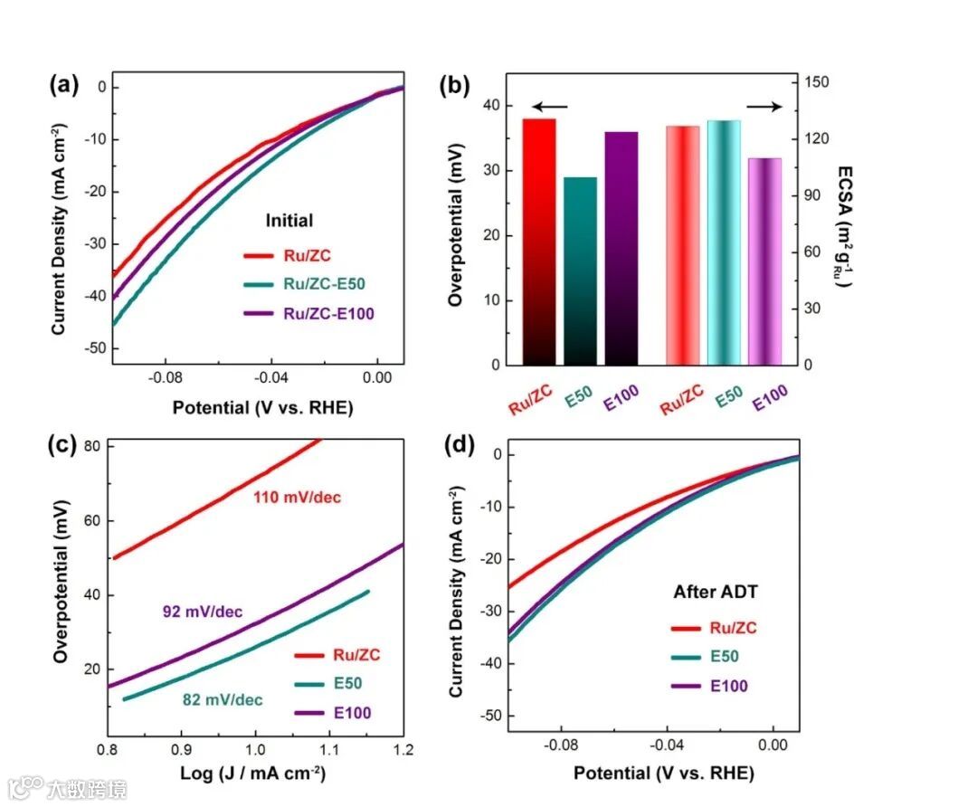 为最大限度地提高Ru/ZC催化剂的界面效应,提出了一种酸蚀处理(AET)策略。经过适当蚀刻处理的Ru/ZC-E50催化剂显示出更小的Ru尺寸和更多暴露的Ru-C界面,实现了仅26 mV的过电位和82 mV的Tafel斜率。