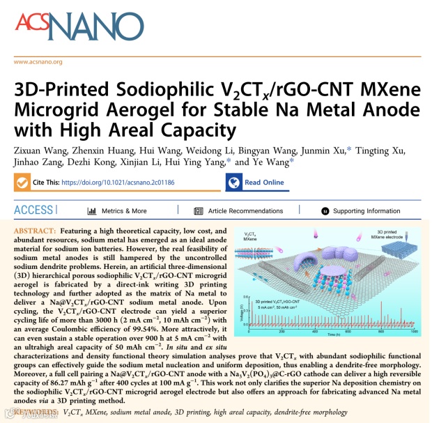 Wang, Zixuan; Huang, Zhenxin; Wang, Hui; Li, Weidong; Wang, Bingyan; Xu, Junmin*; Xu, Tingting; Zang, Jinhao; Kong, Dezhi; Li, Xin Jian; Yang, Hui Ying*; Wang, Ye*, ‘3D printed sodiophilic V2CTx/rGO-CNT MXene microgrid aerogel for stable Na metal anode with high areal capacity’ ACS Nano, 2022.