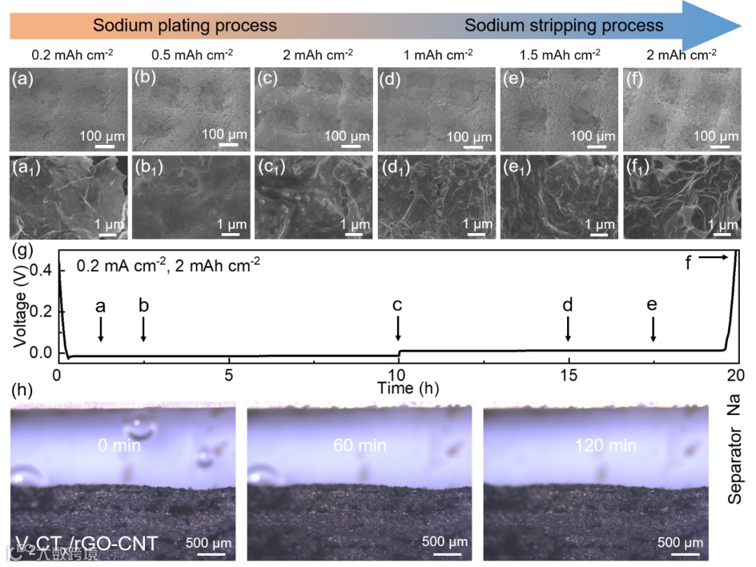 图4. 非原位SEM测试和原位光学显微成像研究钠金属负极在V2CTx/rGO-CNT电极上的沉积行为。以电流密度为0.2 mA cm-2,沉积钠的容量为(a,a1) 0.2 mAh cm-2, (b,b1) 0.5 mAh cm-2, (c,c1) 2 mAh cm-2, 然后剥离(d,d1) 1 mAh cm-2, (e,e1) 1.5 mAh cm-2, (f,f1) 2 mAh cm-2的结构形态。(g) 电流密度为0.2 mA cm-2且容量为2 mAh cm-2的相应沉积剥离曲线。(h) Na在V2CTx/rGO-CNT电极上以1 mA cm-2沉积120 min的原位光学显微镜图像。