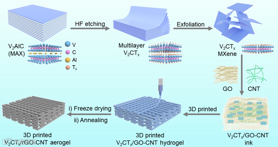 图1. 3D打印V2CTx/rGO-CNT微格气凝胶电极制备示意图。