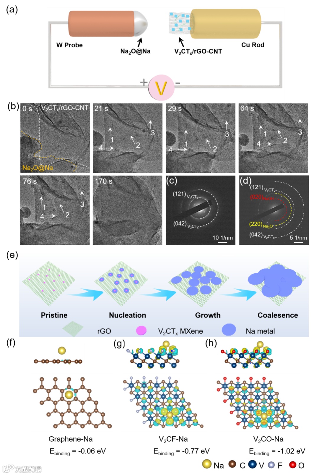 图5. 利用原位TEM分析钠金属在V2CTx/rGO-CNT电极上沉积过程中形貌演变过程。利用DFT计算Na与C(石墨烯)、F(V2CF)和O(V2CO)的结合能。(a) 原位TEM测试示意图。(b) V2CTx/rGO-CNT镀钠过程的原位电子显微镜快照。(c) 镀钠前的SAED图谱。(d) 镀钠后的SAED图谱。(e) 钠沉积过程示意图。(f) Na与C(石墨烯)的吸附模型。(g) Na与F(V2CF)的吸附模型。(h) Na与O(V2CO)的吸附模型。