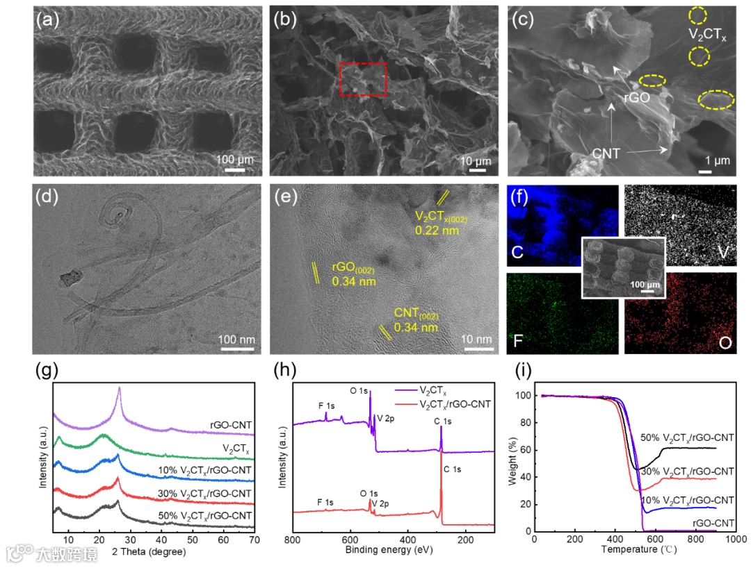 图2. 3D V2CTx/rGO-CNT微网格电极的结构表征。(a-c) V2CTx/rGO-CNT微网格气凝胶的SEM图像。(d) V2CTx/rGO-CNT纳米复合材的TEM图像。(e) 高分辨TEM图像。(f) V2CTx/rGO-CNT微格电极截面的SEM图和相应的EDS元素图谱。(g) rGO-CNT,V2CTx,不同比例V2CTx/rGO-CNT的XRD图谱。(h) V2CTx,V2CTx/rGO-CNT的XPS图谱。(i) rGO-CNT,不同比例V2CTx/rGO-CNT微网格电极从室温到900℃在空气下的TGA曲线。