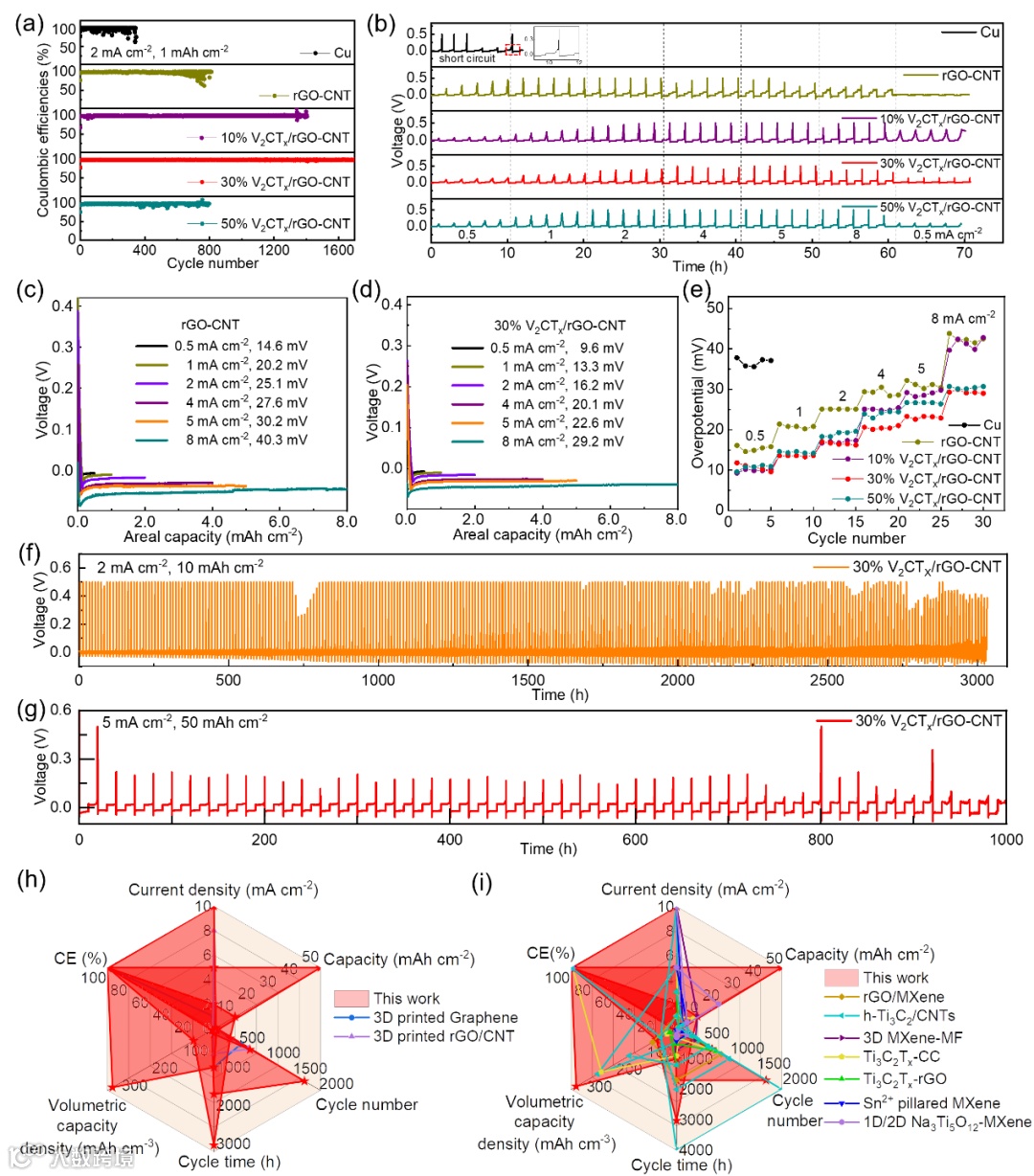 图3. V2CTx/rGO-CNT电极的电化学性能测试。(a) 在电流密度为2 mA cm-2,容量为1 mAh cm-2下各电极的库伦效率图。(b) 倍率性能。(c-d) 电压-容量曲线。(e) 在不同电流密度下各电极的成核过电势。(f-g) 循环性能图。