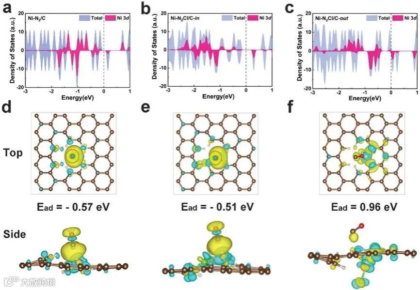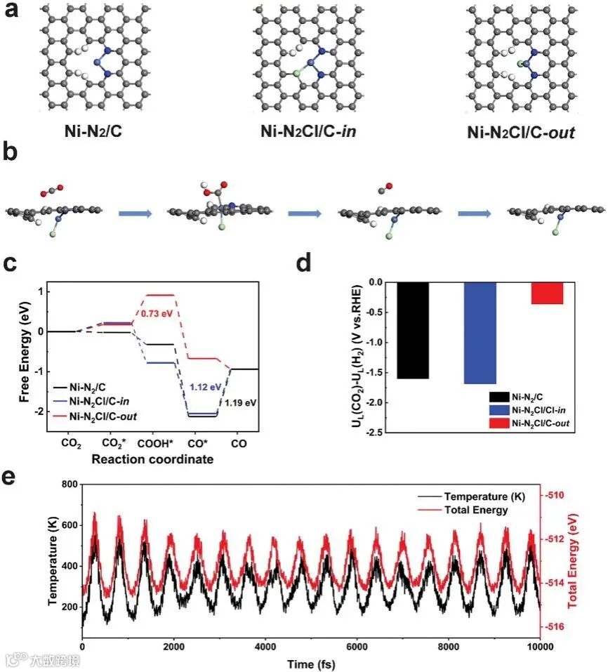 DFT计算表明,制备的Ni-N2Cl/C催化剂具有较好的平衡COOH*生成和CO*脱附的能力;此外,结合原位拉曼表征和DFT计算确定了Cl原子是以离面配位形式存在的;带有离面Cl配位的Ni-N2Cl/C上较低的CO结合能促进了CO的脱附,导致了优异的CO2RR性能。