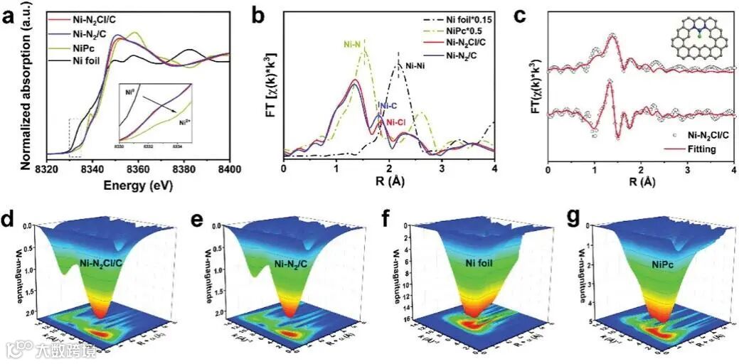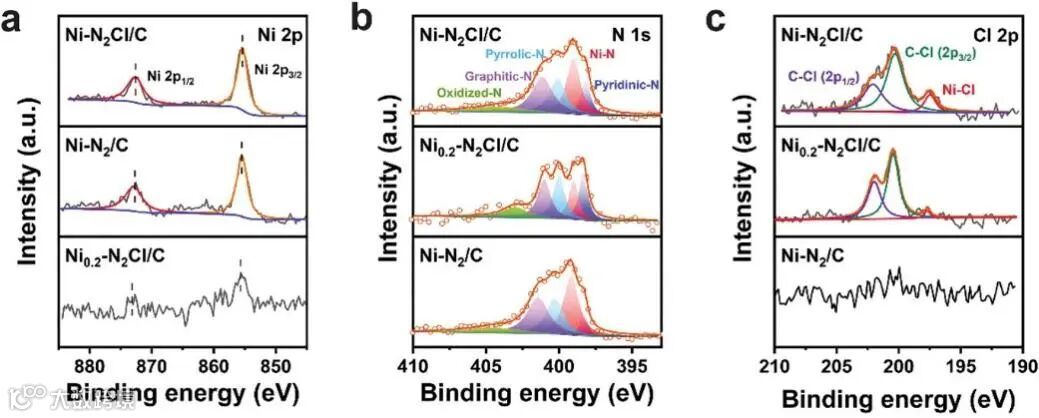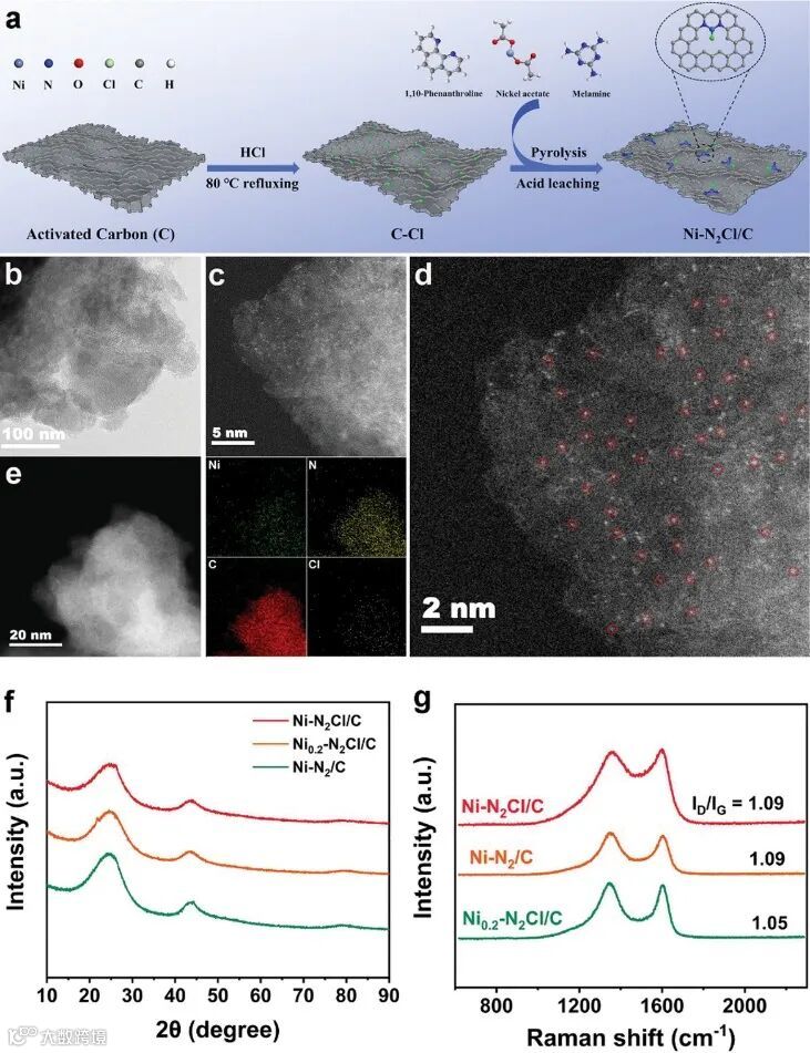 首先对碳载体进行氯官能团化,XPS证实了Cl原子的成功引入;通过在Cl官能团化碳载体上热解金属和含氮前驱体的复合物成功构筑了高度分散的Ni-NC-Cl单原子催化剂。HAADF-STEM证实了高度分散的Ni单原子,EXAFs证实了不饱和的Ni-N2结构,XPS和EXAFs证实了配位Cl原子的存在。