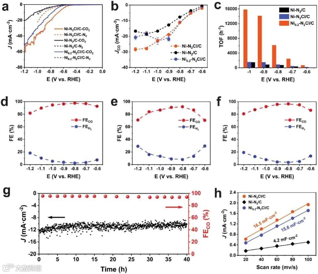 得益于配位Cl原子的存在,Ni-N2Cl/C催化剂表现出出色CO2RR性能,在-0.6V到-1.2V vs RHE电势范围内,FECO大于80%。在40小时的稳定性测试中,FECO和电流密度的衰减几乎可以忽略不计。此外,带有配位Cl原子的Ni-N2Cl/C催化剂对CO的TOF值高达15808 h-1,是Ni-N2/C催化剂的10倍多。
