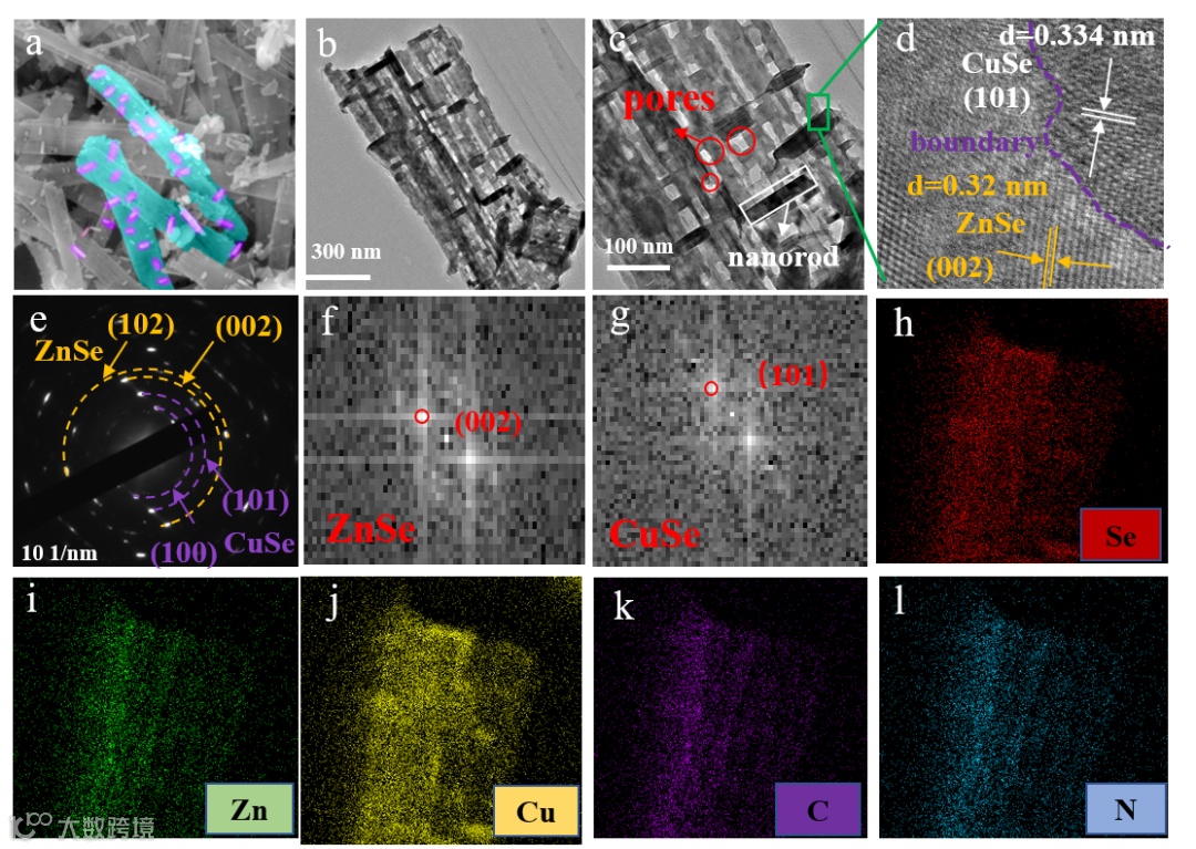 图3. CuSe/ZnSe@NC 的(a) SEM 图像, (b, c, d) TEM图像, (e) SAED 图像, (e) 傅里叶变换 (FFT) 图像和EDS 映射图像, (h) Se, (i) Zn, (j) Cu, (k) C, (l) N。