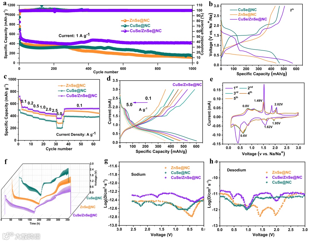 图4. CuSe/ZnSe@N、CuSe@NC、ZnSe@NC的电化学性能测试。a)在1 A g-1电流密度下充放电循环,b)第二圈的恒流充放电曲线,c)倍率性能图以及d)各电流密度下的充放电曲线;e)CuSe/ZnSe@NC的前五圈CV曲线,f)GITT测试计算得出的g)放电和h)充电时钠离子扩散系数。