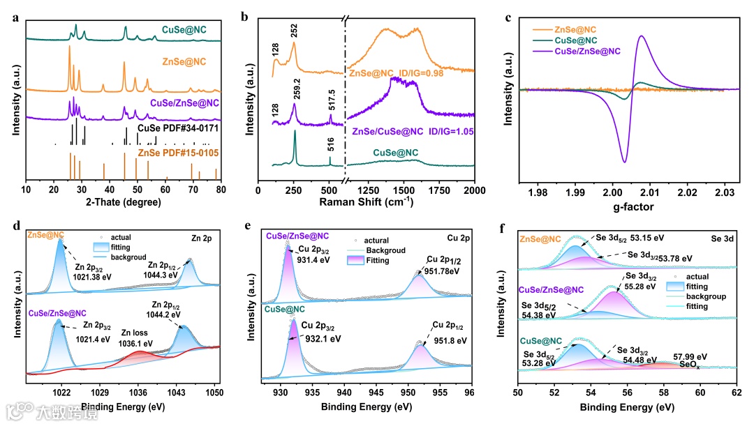 图2. CuSe/ZnSe@NC、CuSe@NC和ZnSe的(a) XRD图谱,(b) Raman光谱,(c) EPR,d) Zn 2p, e) Cu 2p, f) Se 3d @NC的 XPS光谱。