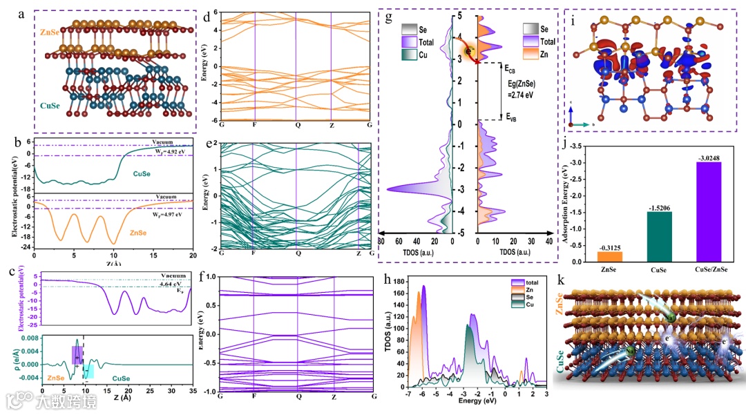 图7. DFT计算。a)CuSe/ZnSe的计算模型。b)ZnSe 和 CuSe 的计算势表面。(c)双金属硒化物的平面静电势和电荷密度差曲线,正值表示电荷积累,负值表示电荷耗散。费米能级价带结构:d)ZnSe,e)CuSe,f)CuSe/ZnSe。相应原子态密度:g)ZnSe和CuSe,h)CuZnSe,i)CuSe/ZnSe的结构界面处差分电荷密度,等值面取值为0.015 eV/ Å3,蓝色为电子的积聚区域,红色为电子的消散区域。j)三种材料对钠离子的吸附能。k)CuSe/ZnSe异质结结构界面处促进钠离子快速转移的机理图。