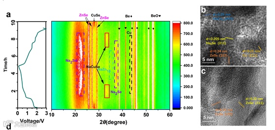 图5. CuSe/ZnSe@NC电极中钠存储过程的机理分析。a)CuSe/ZnSe@NC的恒流充放电曲线以及相对应的原位XRD图。b)放电至0.1 V和 c) 充电至3.0 V的非原位HRTEM,和d)CuSe/ZnSe电极在初始循环期间的相变原子模型。