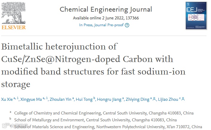 Xu Xie1, Xingyue Ma1, Zhoulan Yin, Hui Tong, Hongru Jiang, Zhiying Ding*, Lijiao Zhou*,Bimetallic heterojunction of CuSe/ZnSe@Nitrogen-doped Carbon with modified band structures for fast sodium-ion storage, Chemical Engineering Journal (2022)
