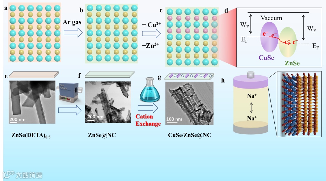图1. CuSe/ZnSe@NC的合成流程图,(a) ZnSe(DETA)0.5,(b) ZnSe@NC,(c) CuSe/ZnSe@NC的晶体结构,(d)电荷再分布示意图。(e)ZnSe(DETA)0.5、(f) ZnSe@NC、(g) CuSe/ZnSe@NC的TEM图像和(h)用于SIBs的双金属硒化物CuSe/ZnSe@NC异质结。
