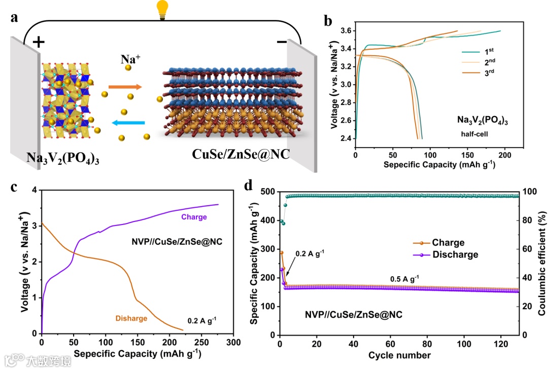 图8. CuSe/ZnSe@NC//NVP全电池的电化学性能:a)工作机理示意图,b)NVP正极典型充放电曲线,c)恒电流充放电曲线,e)0.5A g-1下循环性能。