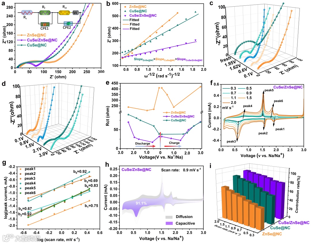图6. 电化学阻抗以及化学反应动力学分析。a)材料的初始状态的Nyquist图,及等效电路模型以及b)低频区直线斜率比较。c)CuSe/ZnSe@NC在第四次放电和充电过程中不同电压点的Nyquist图,和不同d)放电,充电深度下Rct与V的关系。e)不同扫描速率下CuSe/ZnSe@NC的CV曲线。f)CuSe/ZnSe@NC的log (scan rate) -log (peak current)关系图。g)CuSe/ZnSe@NC负极极在0.9 mV s-1的CV曲线中的电容贡献。h)ZnSe@NC,CuSe@NC和CuSe/ZnSe@NC在不同扫描速率下的电容控制贡献。