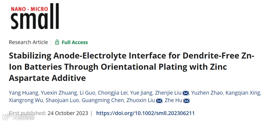 Yang Huang,✝ Yuexin Zhuang,✝ Li Guo, Chongjia Lei, Yue Jiang, Zhenjie Liu,* Yuzhen Zhao, Kangqian Xing, Xiangrong Wu, Shaojuan Luo, Guangming Chen, Zhuoxin Liu,* and Zhe Hu.* Stabilizing Anode-Electrolyte Interface for Dendrite-Free Zn-Ion Batteries Through Orientational Plating with Zinc Aspartate Additive, Small 2023, DOI:10.1002/smll.202306211