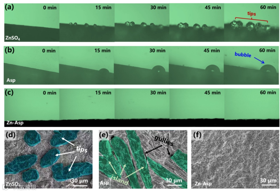 腐蚀反应会导致ZMA表面不规则电场的加剧,进而加速Zn2+沉积过程中的锌枝晶生长。Zn-Asp添加剂的加入有助于解决AZIBs中锌枝晶问题。为实时监测Zn-Asp添加剂引入前后Zn2+沉积行为的变化,该研究采用原位光学显微镜检测了ZMA-电解液界面的演变情况。如图1a-c,相比于初始电解液及含有Asp添加剂的电解液,ZMA在含有Zn-Asp添加剂的电解液经历连续60分钟的Zn2+沉积后,仍保持了光滑的表面,没有任何尖端突起和气泡的生成。这些结果明确表明Zn-Asp添加剂有效抑制了Zn枝晶的生长。