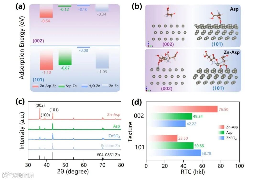 除了对Zn2+溶剂化结构的影响外,电解液添加剂还将影响Zn2+在ZMA表面的吸附行为。具体而言,由于添加剂不同的结构特性,添加剂分子在ZMA的不同晶面上的吸附能会有所变化(图3a)。图3b展示了Asp和Zn-Asp添加剂在(002)和(101)晶面上的吸附模型。DFT计算显示,Zn2+、Asp和Zn-Asp均倾向于在ZMA的(101)晶面上吸附,而不是(002)晶面,因为它们在(101)晶面上的吸附能均更负于(002)晶面上的吸附能。值得注意的是,与Zn2+相比,Zn-Asp分子在(101)晶面上的吸附能更低。因此,Zn-Asp会优先吸附在(101)晶面上,进而阻止Zn2+接近(101)晶面,最终促使Zn2+在(002)晶面上有序生长并形成平滑且无枝晶的表面。相应的XRD及相对纹理系数(RTC)结果也证明了Zn-Asp在调控Zn2+沿(002)晶面定向沉积的有效作用(图3c-3d)。