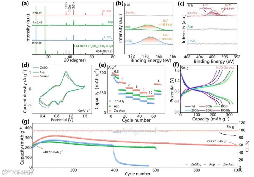 为了进一步全面评估Zn-Asp对锌沉积/剥离的影响,作者组装了Zn||Ti电池。如图4a所示,初始电解液的平均库伦效率(CE)仅为90.90%。相比之下,使用Zn-Asp电解液的电池显示出最高的平均CE,达到了99.29%,同时其极化电压也最低。另外,为了研究电解液的长循环稳定性,作者还使用不同电解液组装了Zn||Zn对称电池。如图4b所示,由于锌枝晶的无序生长,使用初始电解液的电池在经历约200小时的沉积/剥离循环后,便表现出了短路的情况。由于非导电副产物的不断积累,使用Asp电解液的电池在长循环过程中会发生明显的极化现象。对比之下,使用Zn-Asp电解液的电池循环稳定性得到显著改善,并能够稳定工作超过3200小时。这些结果进一步证实了Zn-Asp添加剂在抑制锌枝晶生长、HER和副产物方面的有效性。在初始电解液中,循环后的ZMA表面覆盖了大量的尖端和空隙,导致表面非常粗糙(图4e)。相比之下,使用Zn-Asp电解液时,ZMA表面最光滑(图4g)。全电池方面,与使用初始电解液和Asp电解液的电池相比,使用Zn-Asp电解液电池的倍率和循环性能均有明显提高(图5e和f)。在5A g-1的电流密度时,使用Zn-Asp电解液的全电池的初始容量为240.77 mAh g-1;经过1000次充放电后,其容量略微降至223.37 mAh g-1,实现了92.7%的高容量保持率。
