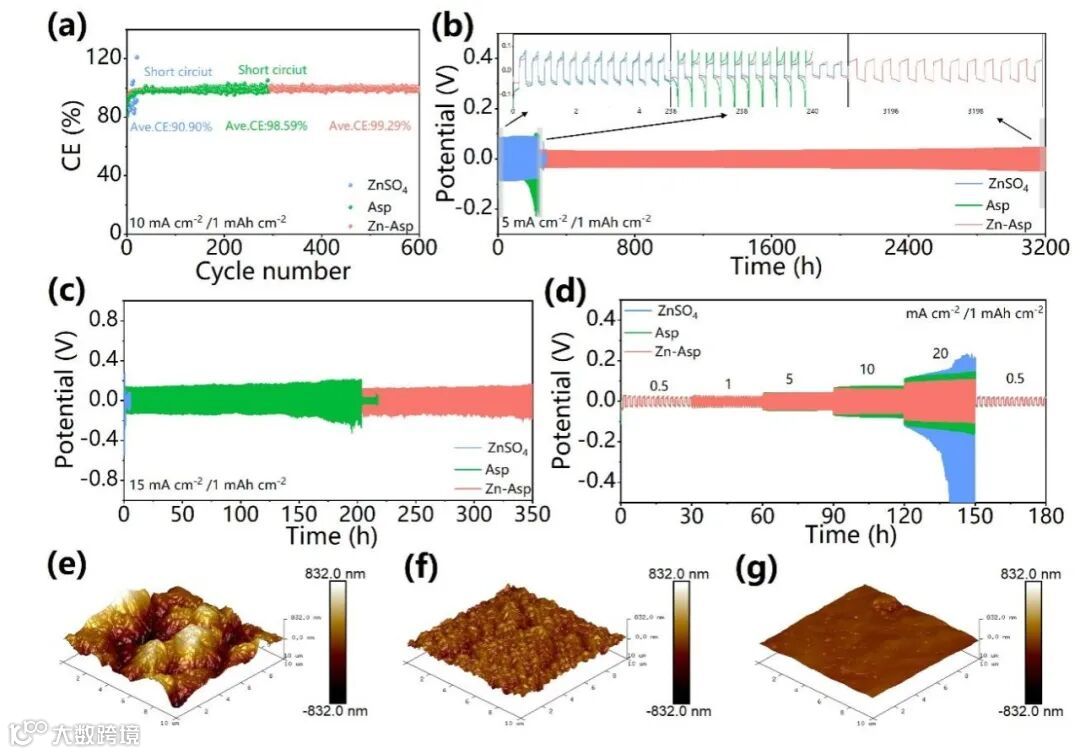 图4. 不同电解液添加剂组装Zn||Ti电池、Zn||Zn对称电池性能及AFM表征