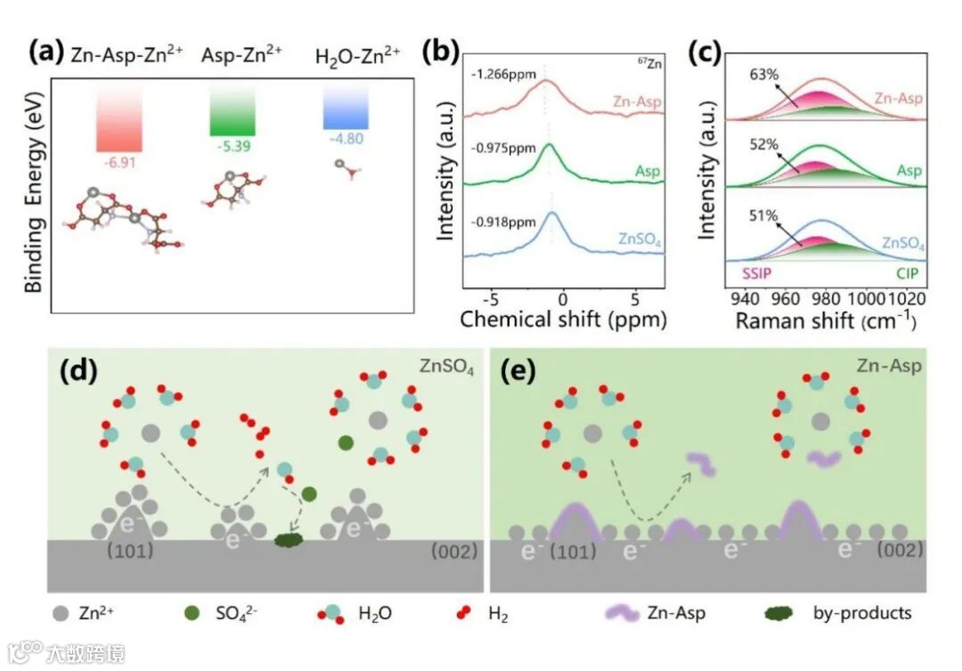 同时作者使用密度泛函理论(DFT)研究了电解液各组分和Zn2+之间的相互作用,以确认Zn-Asp对Zn2+溶剂化结构的影响。如图2a所示,比较Zn2+与H2O、Asp和Zn-Asp分子之间的结合能,发现Zn2+与Zn-Asp之间的结合能最负(-6.91 eV),表明Zn-Asp对于Zn2+的溶剂化结构具备强参与作用。这一结果与图2b中显示的67Zn核磁共振结果一致:由于Zn-Asp参与Zn2+溶剂化结构致使峰位置向低化学位移偏移。因此,在适量Zn-Asp添加剂的溶剂化作用下,Zn2+脱溶过程中产生的游离水分子减少,最终减轻甚至消除发生在ZMA-电解液界面上的副反应(图2d和e)