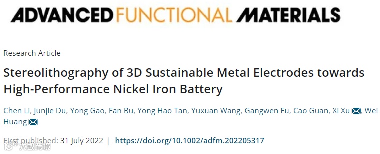 基于此,西北工业大学的黄维院士团队徐茜副教授在国际知名期刊Advanced Functional Materials 上发表题为“Stereolithography of 3D Sustainable Metal Electrodes towards High Performance Nickel Iron Battery”的研究文章。