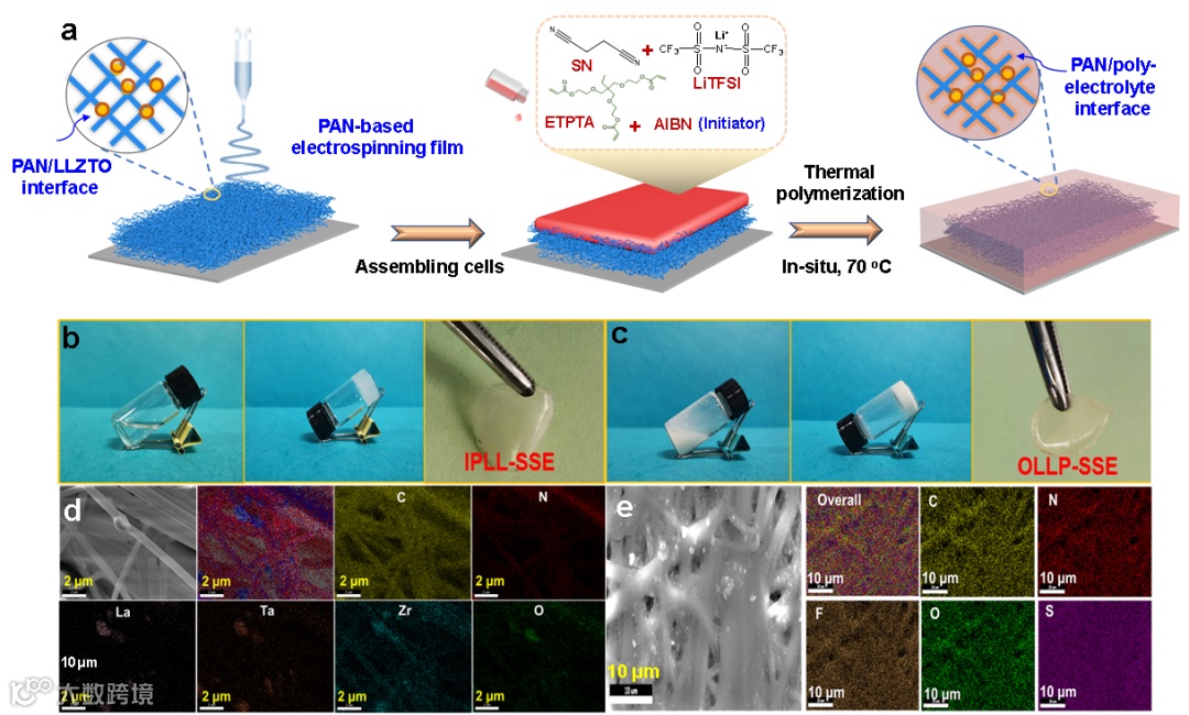图1. (1)预先将LLZTO与PAN纺丝整合的复合固态电解质与(2)先将LLZTO粉末与聚合物电解质前驱体混合的而制备的复合固态电解质的合成流程、结构与形貌特性。