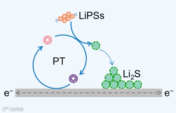 图1. PT介导的锂硫电池反应路径。PT在放电过程通过构建反应旁路介导硫化锂的沉积。