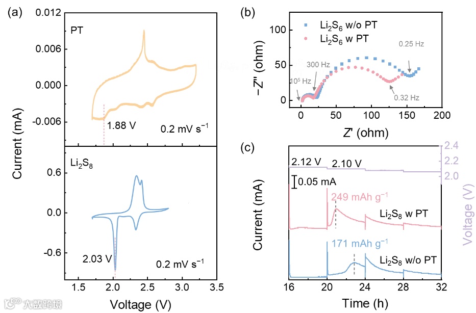图2. PT对于硫正极反应动力学的影响。(a)Li|PT和Li|Li2S8电池的CV。(b)Li2S6对称电池的EIS谱图。(c)Li|Li2S8电池的PITT放电曲线。