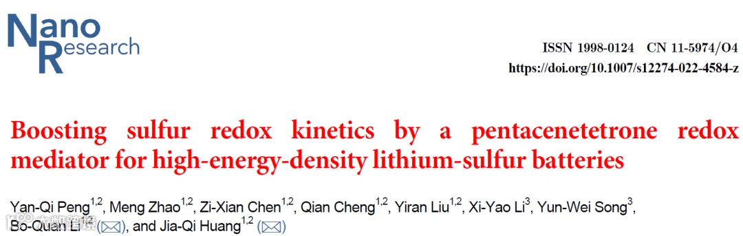 基于此,北京理工大学的李博权副研究员和黄佳琦教授在国际知名期刊Nano Research上发表题为“Boosting sulfur redox kinetics by a pentacenetetrone redox mediator for high-energy-density lithium-sulfur batteries”的研究论文。