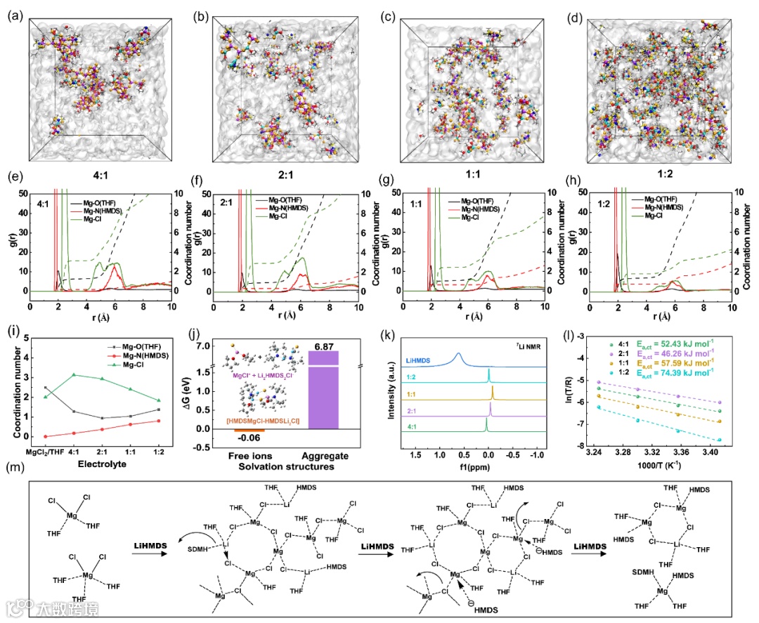 少量添加的LiHMDS盐会与MgCl2在THF溶剂中形成耐水的[MgxLiyHMDSzCl2x+y-z· nTHF] 聚集体溶剂化结构,并降低镁离子的脱溶剂化能;但过量添加的LiHMDS盐会使得[MgxLiyHMDSzCl2x+y-z· nTHF] 聚集体发生解离。使用无机LiCl作为共同添加剂可以重建[MgxLiyHMDSzCl2x+y-z· nTHF] 功能聚集体并避免其发生解离。这一发现将促进研究人员对镁电解液溶剂化结构优化的研究。
