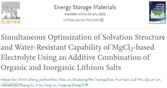 Haiyan Fan, Xinxin Zhang, Jianhua Xiao, Yitao Lin, Shuaiyang Ren, Yuxing Zhao, Hua Yuan, Ludi Pan, Qiyuan Lin, Haowen Liu, Yipeng Su, Yi Su, Yang Liu, Yuegang Zhang, Simultaneous Optimization of Solvation Structure and Water-Resistant Capability of MgCl2-based Electrolyte Using an Additive Combination of Organic and Inorganic Lithium Salts, Energy Storage Materials, 2022,