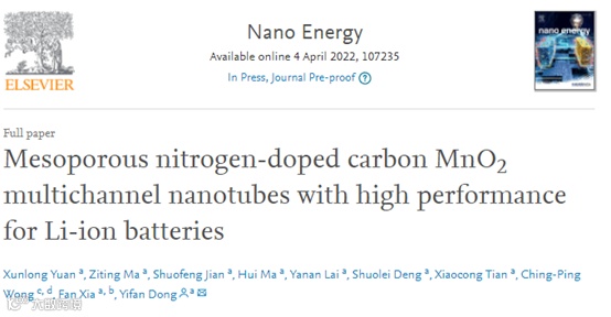 基于此,来自中国地质大学(武汉)的董轶凡研究员团队在国际知名期刊Nano Energy上发表题为“Mesoporous nitrogen-doped carbon MnO2 multichannel nanotubes with high performance for Li-ion batteries”的研究文章。