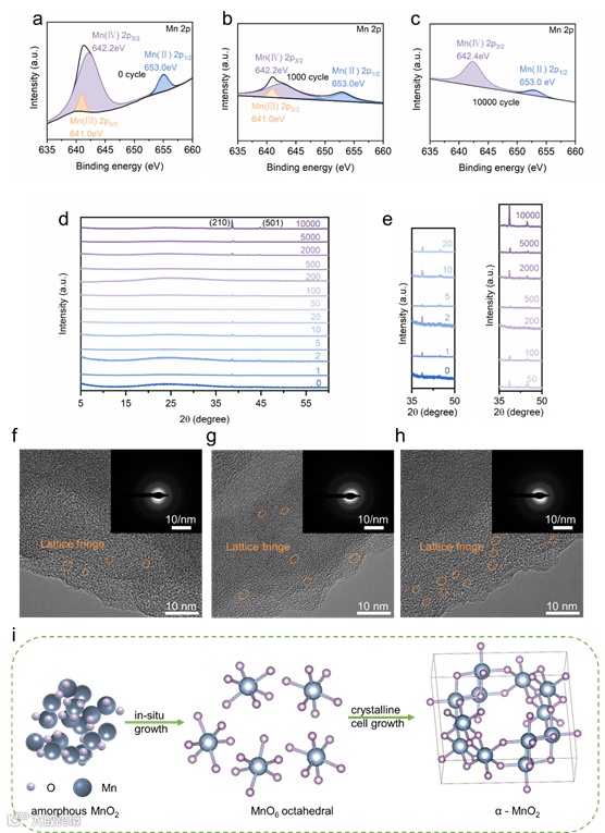 图5. MnO2@PNC在(a)未循环,(b)1000次循环后和(c)10000次循环之后的高分辨率Mn 2p XPS光谱;(d)不同循环次数后MnO2@PNC电极的非原位XRD;(e)放大的XRD晶面衍射峰图;MnO2@PNC在(f)未循环,(g)1000次循环和(h)5000次循环(插图是相应的SAED图)之后的HRTEM图;(i)MnO2@PNC的原位生长过程。