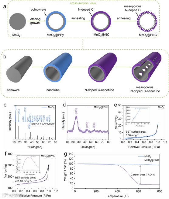 图1.(a)MnO2转化为MnO2@PNC的横断面图和(b)MnO2转化为MnO2@PNC的示意图;(c)MnO2和(d)MnO2@PNC的XRD谱图;(e)MnO2和(f)MnO2@PNC的N2吸附和解吸等温线;插图为MnO2和MnO2@PNC对应的孔径分布;(g)MnO2和MnO2@PNC的TGA曲线。