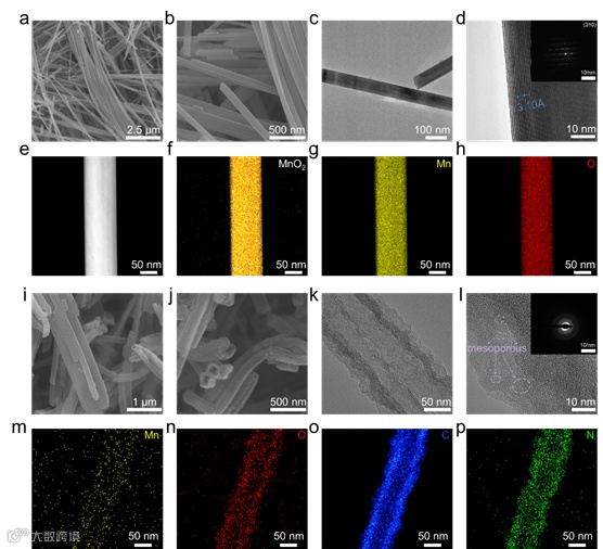 图2.(a)MnO2的低倍FESEM图、(b)高倍FESEM图、(c)TEM图、(d)HRTEM图(插图为相应的SAED图);(e)MnO2原貌和(f)MnO2、(g)Mn、(h)O的EDS能谱图;(i)MnO2@PNC的低倍FESEM图、(j)高倍FESEM图、(k)TEM图,(i)HRTEM图(插图为对应的SAED图);MnO2@PNC中(m)Mn、(n)O、(o)C、(p)N的EDS能谱图。