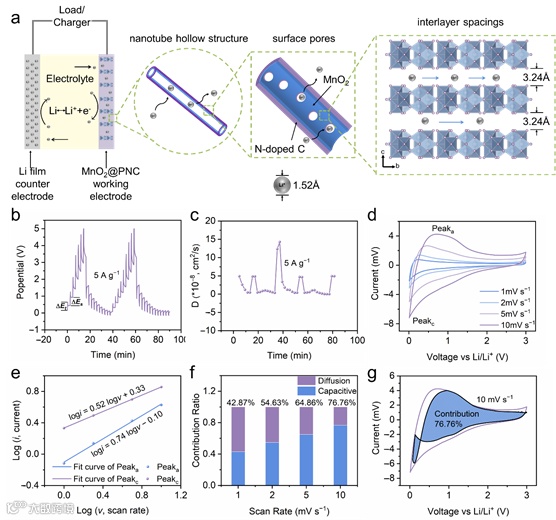 图4. 锂离子在MnO2@PNC中的三种超快传输形式;(b)MnO2@PNC的GITT曲线;(c)根据(b)的GITT曲线计算的锂离子扩散系数;(d)不同扫描速率下MnO2@PNC的CV曲线;(e)对数(i)与对数(v)在不同阴极/阳极峰值下的图;(f)电池在各种扫描速率下电容控制(蓝色)和扩散控制(紫色)容量的归一化贡献比;(g)MnO2@PNC在10.0 mV s-1扫描速率下的电容贡献,阴影区域为赝电容贡献。