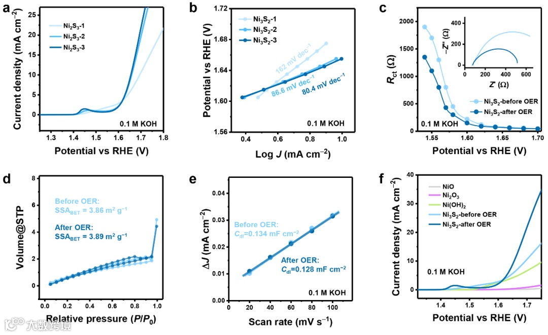 实验发现,硫化镍的OER活性会随着测试的进行而不断优化,并最终趋于稳定,即“自活化”现象。结合进一步实验,作者排除了导致自活化的下述潜在因素,包括转变为氢氧化物(因为氢氧化镍的活性尚不及活化后的硫化镍)、比表面增大(活化前后比表面、ECSA等指标基本不变)。