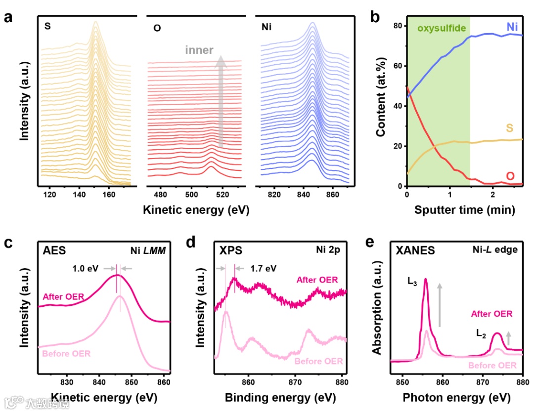 这暗示着,硫化镍在经历OER后,表面形成了不同于氧化物/氢氧化物/硫化物的新物种,该物种具有高OER活性。