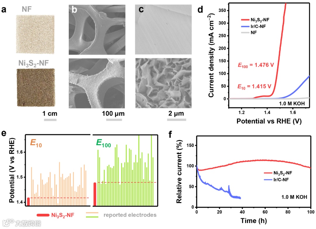 作者进一步基于泡沫镍合成了硫化镍独石电极,该电极呈现出优异的OER活性与稳定性。这进一步印证了硫化氢氧化物物种的高本征活性与行使OER功能的长效性。