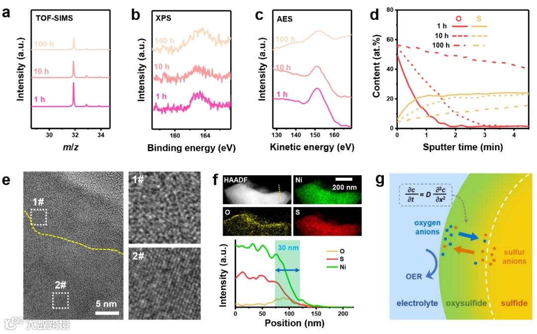 【异】:随OER时间的增长,外层硫化氢氧化物的厚度不断增大,这源于硫离子与(氢)氧根离子的扩散。